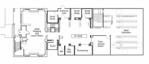 This floor plan highlights the layout for adult reading and local history, small study rooms, ADA-compliant restrooms, teen collection and activity rooms, and the main circulation and processing areas.